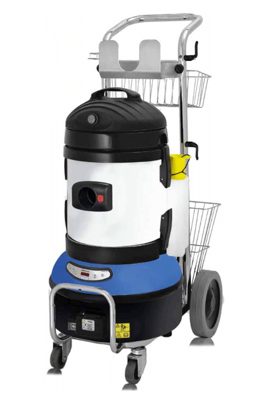 Generador de vapor MONOFÁSICO con sistema de recarga automática con sensor de nivel electromecánico al interno de la caldera – True Temp, inyección de detergente, combinado con un aspirador agua/polvo dotado de un flotador. Modelo ergonómico. Consola electrónica de mando con termómetro, manómetro, cuentahoras, aviso “CALC” para limpieza caldera.